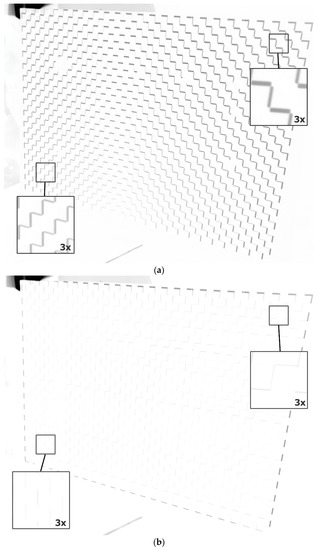 The presented results confirm that the calculated compensation model allows for a significant reduction in image deformation caused by changes in the external temperature of the projector. For the calculated coordinates of the markers, the deviation values achieved a 92% decrease for the horizontal direction and a 94% decrease for the vertical direction after compensation. Figure 16 shows the effects of the application of the compensation model more realistically and qualitatively. Figure 16a was created by subtracting the frame collected at the reference temperature and the frame collected at the temperature of with the projection without compensation, where a black and white chessboard pattern (field width 25 px) was used as the projected image. In order to improve visibility, the intensity of the output image was additionally inverted. The edges associated with the image shift and its deformation caused by the temperature change of the projector can be observed. In the central and bottom parts of the projected image, the shifts are the smallest and propagate radially towards the image corners. This corresponds to the trend observed in the experiment described in Section 4.1.