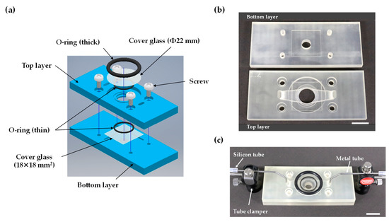 The emergence of additive manufacturing techniques such as three-dimensional (3D) printing has had a significant impact on medical and biological research [1,2]. One key advantage of 3D printing in comparison with conventional manufacturing methods such as machining is that complex 3D structures can be built directly, with rapid prototyping and flexible design. These features mean that 3D printing has high potential to resolve various issues in biological research. The real-time monitoring of cellular activity via live-cell imaging in perfusion chambers holds a prominent position in modern cell biology research [3,4] and is applied to numerous biosensing techniques [5,6,7]. However, although live-cell imaging protocols regarding the experimental set-up and reagents are well established [4,8], air bubble accumulation is still a serious concern for perfusion chamber systems [9,10]. These bubbles can interrupt experimental procedures and nullify experimental results, but are difficult to remove from flow channels and observation areas [11]. Therefore, a method of removing or preventing bubble formation in fluidic systems is of considerable need.