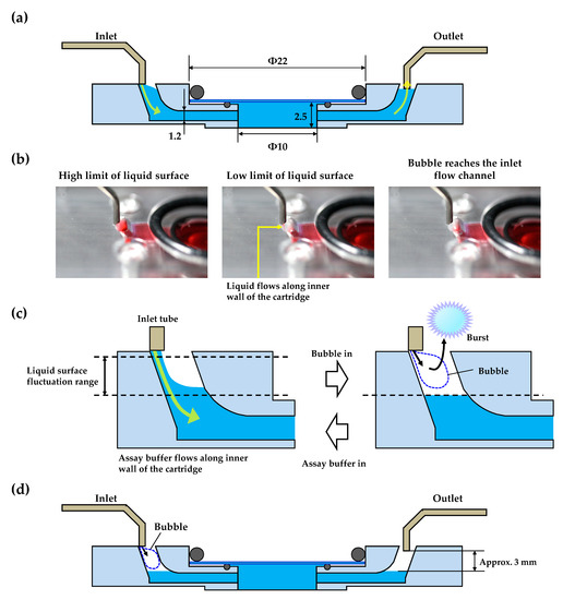 To clarify the mechanism of bubble removal from the cartridge, we fabricated a transparent cartridge and perfused ultra-pure water colored with red food dye. Images of the liquid surface levels are shown in Figure 2b, and a video clip is available in the Supplementary Materials (Video 1). This test showed that there were maximum and minimum fluctuation levels for the liquid surface in the longitudinal direction of the flow channel. An enlarged schematic diagram of the inlet side of Figure 2a is shown in Figure 2c to describe the mechanism of bubble removal. During perfusion, the liquid surface on the inlet side fluctuated between the maximum and minimum levels. In this case, bubbles from the inlet tube do not reach the observation area because they cannot pass through the horizontally directed flow channels. The bubbles therefore disintegrate in the vertically directed flow channels or outside the cartridge. The liquid surface on the outlet side is automatically drawn toward the outlet-side flow channel; however, this surface did not exceed the height of the outlet-side metal tube tip because the flow rate of the outlet peristaltic pump was set to greater than 1.5 mL/min (approximately, 2.0–2.5 mL/min). There is a gap (approximately 3 mm) between the horizontal level of the medium and the tip of the outlet-side metal tube (Figure 2d) in the 3D-printed cartridge. Therefore, the outlet pump does not draw the medium from the observation area or the horizontal direction flow channel when large bubbles are introduced from the inlet side, or even if perfusion is stopped. This is one of the advantages of our system.