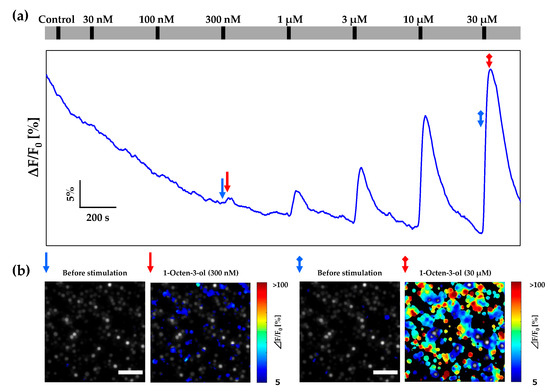 We were concerned that a closed cartridge could reduce the sensitivity of Or13a cells. However, these results indicated that the dose-dependent responses of Or13a cells were consistent with those from previous studies. While the Or13a cells did not respond to 30 nM and 100 nM 1-octen-3-ol stimulations, the clear-cut response of Or13a cells toward the 300 nM odorant stimulation was detected in the response profile and the Or13a cells exhibited fluorescence intensity changes of more than 5% after stimulation, as shown in Figure 3b.