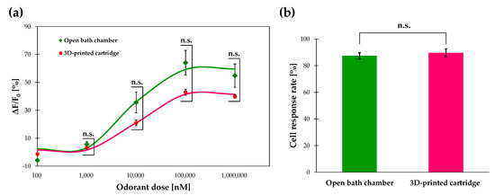 (a) Comparison between average dose-dependent response of Or13a cells in the 3D-printed cartridge with a 20× objective lens and in a commercial open bath camber with a 20× water-immersion objective lens previously used for Sf21 cells expressing insect ORs. The data represent the mean ± standard error of the mean (SEM) of the fluorescence intensity changes in all cells (N = 4 individual tests, Welch’s t-test; n.s. = not significant). (b) Comparisons of the cell-response rates in the 3D-printed cartridge and a commercial open bath chamber exhibited greater than 5% increase in fluorescence intensity during 10 μM 1-octen-3-ol stimulation. Data represent the mean ± SEM of fluorescence intensity changes of Or13a cells (N = 4 individual tests, Welch’s t-test: n.s., not significant).