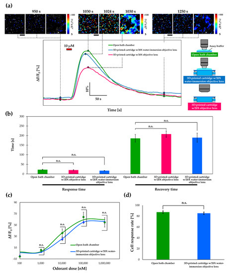 (a) Typical fluorescent response of the Or13a cells using the 3D-printed cartridge and a commercial open bath chamber when 10 µM 1-octen-3-ol stimulations were applied. Upper pseudo-color heat maps of cell-response rates (before stimulation, the peak of fluorescent intensity change, and after stimulation) in a commercial open bath chamber and the 3D-printed cartridge with a 20× water-immersion objective lens or a 20× objective lens exhibited a > 5% increase in fluorescence intensity from the baseline. We defined the start time as 0 s. (b) Comparisons between the average response and recovery times for Or13a cells in a commercial open bath camber and in the 3D-printed cartridge with a 20× water-immersion objective lens or a 20× objective lens. Data represent the mean ± SEM of fluorescence intensity changes in all cells (N = 3 individual tests, Welch’s t-test: n.s. = not significant). (c) Comparison between the average dose-dependent responses of Or13a cells in the 3D-printed cartridge with a 20× water-immersion objective lens and in a commercial open bath chamber. The data represent the mean ± SEM of the fluorescence intensity changes in all cells (N = 4 individual tests, Welch’s t-test; n.s. = not significant). (d) Comparison of the cell-response rates of the cells in the 3D-printed cartridge with a 20× water-immersion objective lens and those in a commercial open bath chamber. The cells in the 3D-printed cartridge exhibited a greater than 5% increase in fluorescence intensity during 10 μM 1-octen-3-ol stimulation. Data represent the mean ± SEM of the fluorescence intensity changes of the Or13a cells (N = 4 individual tests, Welch’s t-test: n.s., not significant).