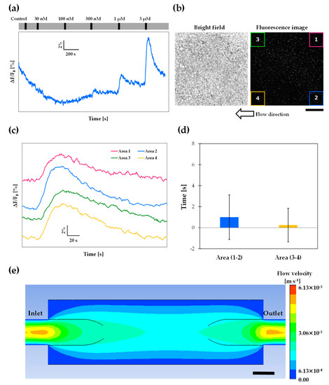 (a) Typical dose–response profiles of fluorescence intensity changes in Or13a cells in the 3D-printed cartridge using a 4× objective lens during the addition of 1-octen-3-ol at concentrations ranging from 30 nM to 3 µM. The long grey bar indicates the perfusion of the assay buffer solution including 0.1% DMSO by peristaltic pumps. (b) Bright field and baseline fluorescence images of Or13a cells observed by a 4× objective lens. (c) Each point of fluorescence intensity change in (b) observed by a 4× objective lens. The size of each observation field is 400 × 400 µm2. (d) Difference between response times of Area 1 and Area 2, and differences between response times of Area 3 and Area 4 stimulated by 3 µM 1-octen-3-ol. Data represent the mean ± SEM of calculated time differences between response time of each 400 × 400 µm2 area (N = 4 individual tests). (e) CFD simulation result of flow velocities in the 3D-printed cartridge. These velocities of the cross-sectional view of B–B direction in Figure S1, Supplementary Materials. (e) is represented as a contour. Scale bars: (b) 500 µm; (e) 1 mm.
