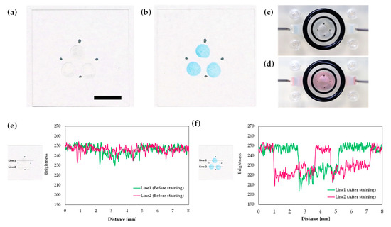 Protein spots on the 18 × 18 mm2 cover glass before and after staining by Coomassie blue dye are shown in Figure 7a,b. These spots were brightly stained blue without distortion. Images of the top side of the 3D-printed cartridge before and after perfusing Coomassie blue dye are shown in Figure 7c,d. There were no air bubbles in the observation area of the 3D-printed cartridge. We then analyzed the brightness of the protein spots using the ImageJ plot profile command with a one-pixel profile line width (Figure 7e,f). Although brightness reduction was not observed before staining, single brightness reduction with approximately 2 mm width in Line 1 and double brightness reduction with approximately 2 mm width in Line 2 were observed after staining. After using Coomassie blue dye, the 3D-printed cartridge could be washed by a commercial neutral detergent; thus, the cartridge serves as a reusable chemical reactor. These results indicate that protein spots were certainly stained by Coomassie blue dye and that the 3D-printed cartridge is applicable not only for cellular response measurements but also chemical reactions, also while preventing air-bubble invasion.
