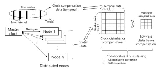 In this section, basic principles of the proposed distributed nodes-based collaborative PTS sustaining method are described. The conceptual diagram of the proposed method is described in Figure 1. Temporal and spatial data of distributed nodes are used to compensate clock disturbances and eventually provide collaboration-based reference clock information. The application of linear prediction algorithms to the temporal data can provide estimation results of clock frequency, which is very useful to maintain precision synchronization during the clock self-correction period. Ensemble averaging is a good candidate for the effective exploration of the spatially distributed clock drift characteristics (i.e., offset, transient slope and the additive noise of individual clocks) providing accurate reference clock estimation by suppressing clock offsets and disturbances. The collection of the slave clocks’ data can be achieved by using management functions defined in the IEEE 1588 PTP standard [1]. Multirate sampled data is used to compensate low-rate disturbances which are distinguished from clock’s statistical features.