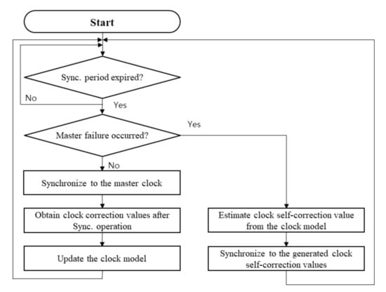 The flow chart of the self-correction is shown in Figure 3. During the periodical PTP-based synchronizing operation, a slave clock updates its clock model by using clock correction values obtained from the result of the synchronizing process with a master clock. The clock model update process is repeated until the occasion of master failure. After master failure, the clock self-correction is activated instead of the master-slave relation-based synchronizing process. The self-correction value is estimated from the constructed clock model. The slave clock synchronizes its clock parameter to the estimated self-correction value. The clock model must not be updated after the master failure since there is no reference information.