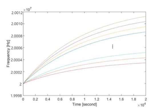 The clock model used in the simulation was created by using a 2-tab IIR filter, where the filter input was a randomly chosen offset value to reflect a saturation characteristic. The nominal frequency of the clock was set to 20 MHz. A zero-mean white gaussian noise with a standard deviation of 1 Hz was added as a disturbance. Two parameters of a clock servo algorithm (i.e., a proportional and an integral constant) were set to 0.1 and 0.3, respectively. Examples of the clock models are shown in Figure 6.