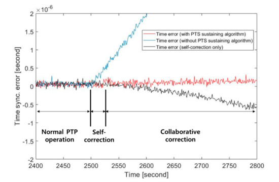 The proposed collaborative PTS sustaining algorithm was implemented with three EVM boards and the PTP equipment to confirm the operation of the proposed algorithm including the collaborative correction phase. Because of difficulty accessing the commercially provided PTP equipment, propagation delay compensation is indirectly reflected by pre-calculated delay values among the EVM boards. The example of PTS sustaining obtained from the experimental test system is illustrated in Figure 9. It is observed that the collaborative correction sustains more than 1 min which is expected to prolong as the number of slave clocks increases. It is worth mentioning that major implementation elements of the proposed PTS sustaining algorithm (i.e., the timestamping and delay correction of the management packets) are readily realizable with the availability of directly modifiable PTP equipment.