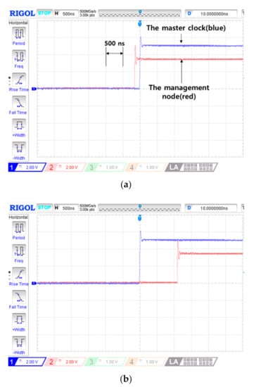 The observation results of 1-PPS signals during the master failure are shown in Figure 8. Three 1-PPS signals (i.e., the management node, the slave clock without the proposed algorithm and the grandmaster clock) were captured by an oscilloscope. The 1-PPS signal of the master clock was used as a reference signal in comparing PTS sustaining performances. When the master failure occurred, both the management node and the slave clock maintained sub-microsecond precision as shown in Figure 8a. The 1-PPS signal of the slave clock exceeds a 1 microsecond time difference after 20 s. On the other hand, the management node sustains a 1 microsecond time difference for 124 s which is very long time compared with the slave clock’s performance, as shown in Figure 8b.