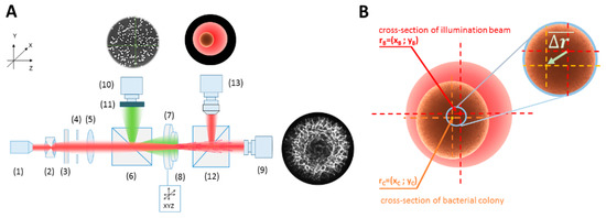 Examination of the E. coli bacteria was carried out using a newly designed, novel, miniaturized system for bacteria identification with converging spherical wave illumination [21] (see Figure 1A). The iris-diaphragm diameter and positioning of the Petri dish with colonies were controlled by the computer unit. Moreover, the additional measurement channel for image recording of all bacterial colonies on the Petri dish was included in the setup to enable the automatic localization of bacterial colonies grown on the medium. The channel combined the cage-mounted pellicle beam splitter (6), which enabled recording of bacterial colonies on the Petri dish in reflection mode, the additional (10) camera with imaging objective (f = 12 mm, Edmund Optics), and the ring illuminator for uniform illumination of the Petri dish. The second channel with a second cage-mounted pellicle beam splitter (12) and high-sensitivity CMOS camera (DCC1240M, Thorlabs) with imaging microscope objective (Nikon, 4x, WD = 30 mm) (13) was used to obtain the enlarged image of a single colony and determine the introduced colony–illuminating beam misalignment.