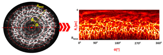 The algorithm was based on the inverse polar transformation of the circular diffraction pattern, which enabled precise examination of the variation of diffracted light intensity at radial distances <0; RMAX> at different Θ angles <0°;360°>. The resulting transformed pattern represented an interpolated diffraction pattern, where the circular structures were converted into rectangular. First, the diffraction pattern’s maximal radius RMAX and origin (Ri = 0) were determined to locate the origin of the coordinate system, and the inverse polar transformation was carried out. After transformation, the set of new signatures, which represented redefined special distribution of intensity depending on Ri and Θ (see Figure 3), were obtained. It was also feasible to obtain new representations of the patterns at different values of the Θ angle: whole pattern at 0–360°; two parts with upper/lower at 0–180° and 180–360° and right/left at 90–270° and 270–90°; or quarters (0–90°, 90–180°, 180–270°, 270–360°). The processed patterns were limited by 10 rectangular-shaped partitioning zones with equal widths of 0.1 RMAX. For each of the zones the quantitative features indicated above were extracted and used for determination of the misalignment direction.