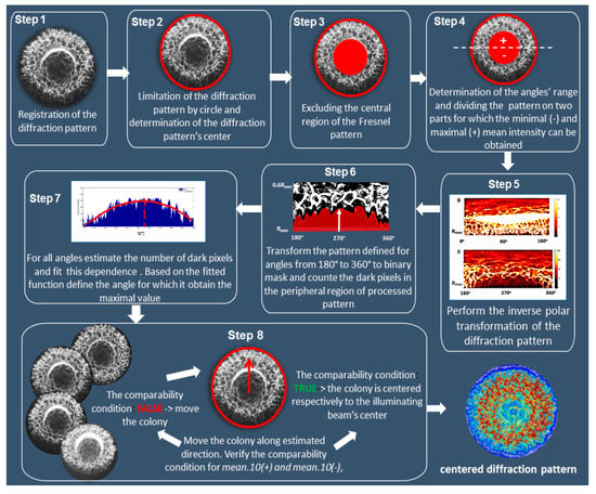 The regions with reduced intensity were located symmetrical to the direction of the illumination dislocation (see Figure 6B). It was associated with the circular symmetry of the diffraction patterns. For increasing Δr-parameter values the reduced intensity area expanded from the peripheral to central regions of the diffraction patterns. Therefore, it was possible to use the information about these changes to estimate the direction of the misalignment and use it to adjust positioning of the bacterial colony to achieve the symmetrical intensity spatial distribution. The above-described observations were used as the foundation for the proposed image-processing algorithm given in the Methodology section and discussed in the next paragraphs.