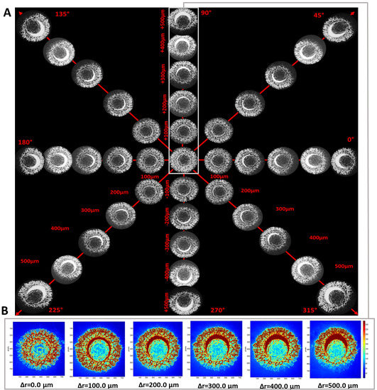 (A) The representative deformation of the diffraction patterns for various ∆r-parameter values (100–500 µm) along four different misalignment directions Θ = 0°;180°, 90°;270°, 135°;315°, 45°;225°. (B) The exemplary images of the bacterial colony diffraction patterns for different values of the ∆r-parameter in the vertical direction (Θ = 90°).
