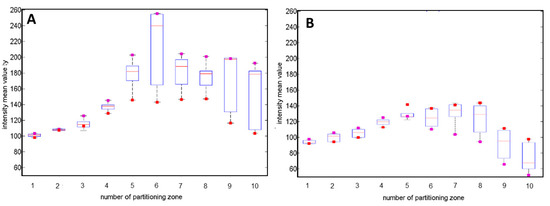 The representative boxplots demonstrating the variation of the diffraction patterns’ mean intensities across 10 partitioning zones of: (A) upper (for Θ = 0°–180°) and (B) lower (for Θ = 180°–360°) parts of the diffraction pattern (red square—mean intensity value of centered pattern for ∆r = 0 µm; violet square—mean intensity value of the decentered patterns for ∆r = +500 µm). Results obtained based on 200 diffraction patterns.