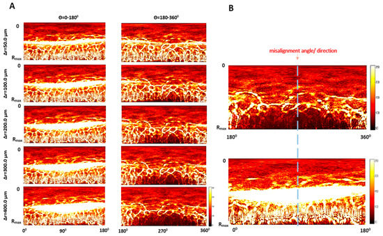 The accuracy of the proposed algorithm in the determination of the appropriate misalignment angles was examined and the results are presented in the Table 3. The highest relative error was equal to 7.14%; however, the region of dark pixels corresponding to the decreased intensity area was larger for higher values of the Δr-parameter. Therefore, additional examination of the erroneousness of misalignment angle determination for different Δr-parameter values was performed, and the results are presented in Table 4.