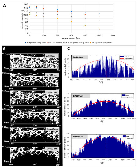(A) Dependence of the mean intensity values from four peripheral partitioning zones on the Δr-parameter values; (B) The representative binary masks of the lower part of processed Fresnel patterns for different Δr-parameter values and for Θ = 280°; (C) The representative dependence of the number of dark pixels for each angle.