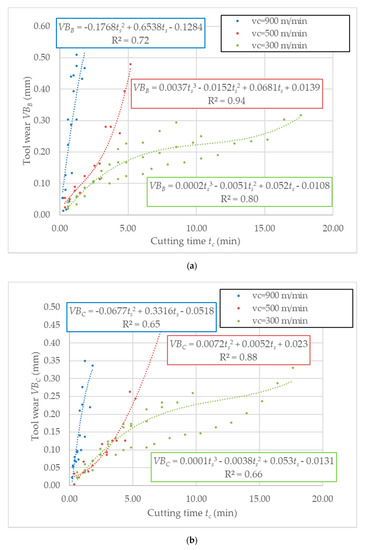 Analysis for the corner wear VBC and the flank wear VBB was carried out separately. The tool wear criterion in both cases was 0.3 mm. The coefficient R2 indicates an adjustment to the selected mathematical function. Figure 3 depicts tool flank wear VBB and VBC values in function of time for all repetitions.