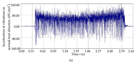 Vibration time course for (a) vc = 300 m/min, (b) vc = 500 m/min, (c) vc = 900 m/min.