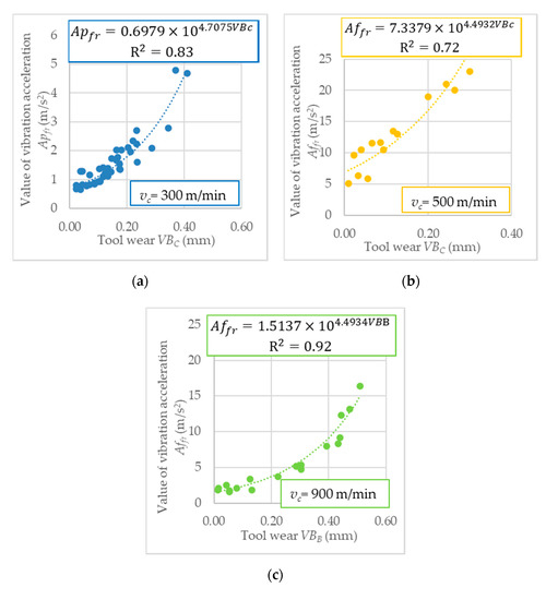 Diagnostic measures of vibration acceleration’s in: (a) frequency domain, vc = 300 m/min; (b) time domain, vc = 500 m/min; and (c) frequency domain, vc = 900 m/min; as a function of tool wear.