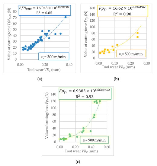 Diagnostic measures of cutting force components in (a) time domain, vc = 300 m/min; (b) frequency domain, vc = 500 m/min; and (c) frequency domain, vc = 900 m/min; as a function of tool wear.