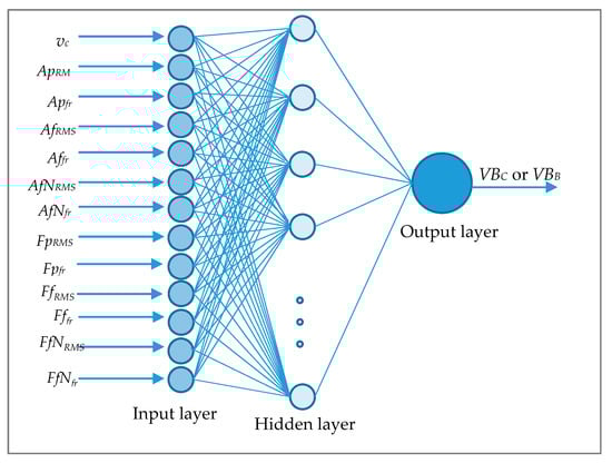 Using ANN in this work was to assess the possibility of predicting tool conditions based on measured signals. The low correlation coefficient between tool wear and diagnostic measures indicates the chances of using other methods than regression models. During this work, a multilayer perceptron (MLP) was used to check the tool wear prediction effectiveness. The input data were diagnostic measures based on the analysis of the cutting forces components and vibration acceleration. One of the steps was focused on learning the neural networks using the Broyden–Fletcher–Goldfarb–Shanno algorithm (BFGS), which is considered one of the most effective. The (BFGS) training algorithm, i.e., back propagation, is characterized by high stability and low error sensitivity [21]. Due to select the best ANN, the activation functions were changed in the hidden and the initial layer: linear, logistic, tangent, and exponential. Figure 7 shows the scheme of structure two-layered MLP network model with thirteen of inputs.