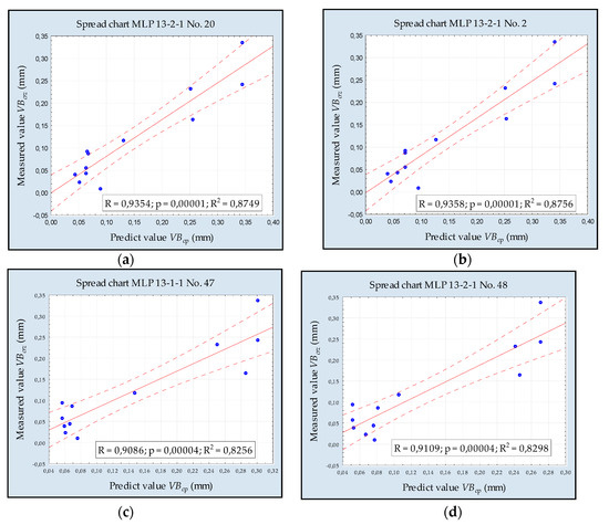 Searching for the model with the most effective quality of ANN network testing for VBC and VBB prediction, the MLP networks were selected with different activation functions and with the least validation errors. The 50 models were checked, and fourteen models with the best testing efficiency were selected. Table 11 presents the characteristics of selected MLP networks for corner tool wear prediction. The number of random samples was assumed at 70% for the training set, 15% for the test set, and 15% for the validation set. The number of epochs for data was 200. The network name means, for example, MLP 13-1-1: 13—input data, 1—hidden layer, and 1—output.