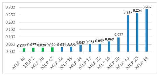 The main criterion for assessing the developed models’ quality was to compare the MSE error for new data. These experimental data were not entered into the network learning process. Figure 9 presents a comparison of the errors of individual MLP networks. The highest error values were observed when the number of neurons in the hidden layer was greater than or equal to nine.