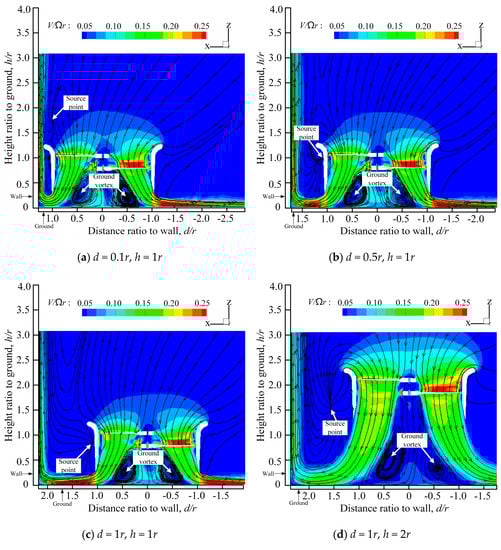 When the distance between the duct and the ground is relatively small, it can be seen from Figure 4a,b that compared with Figure 4e,f, the degrees of the ground vortexes are intensified. At the same time, due to the obstruction of the duct, the airflow out of the lower rotor is compressed sharply and spreads rapidly along the ground. With the decrease in the distance between the duct and the wall, the reflection degree of the airflow from the wall surface will become greater and more airflow will no longer just rise along the wall, but will rise above the duct and flow into the duct from the formed source point.