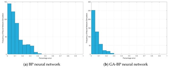 Although the regression performance chart in Figure 14 shows the fitting of the four models, it does not intuitively show the percentage of the different errors of each model in the training dataset. Figure 16 shows the number of data occupied by different percentage errors in the entire training dataset. The error distribution of most data of the four models is within 0–10%, and with the increase in the error percentage, the amount of data is generally decreased, which shows that the trained network model is reasonable. The more data there are in the lower percentage range, the better the fitting of the neural network is, which corresponds to the fitting accuracy of Figure 14.