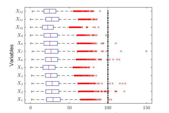 Box plots of the variables. The outliers are shown by using red circles and, according to QAQI [8], the dashed straight line indicates the separation between the desirable level of pollution (i.e., ) and the acceptable level of pollution (i.e., ).