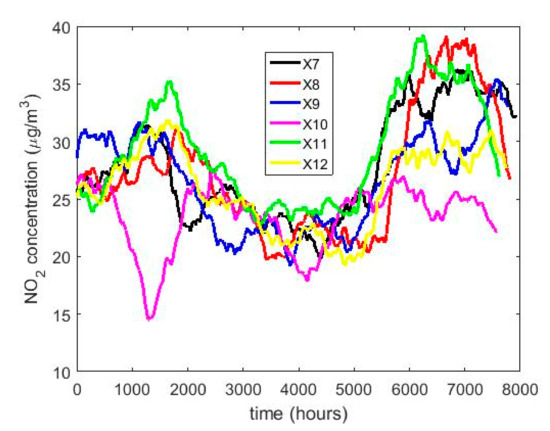 In Quito, the monthly behavior of the NO2 concentration seems to repeat every year [8]. In addition, in [8] it is said that the lowest concentrations of NO2 occur in the summer and the highest in the months of March, October, and November. In this regard, it is important to mention that, as stated in [8], there could be reasons, such as rains, high speed winds and volcanic eruptions, that cause the NO2 concentration to rise or fall at certain times.