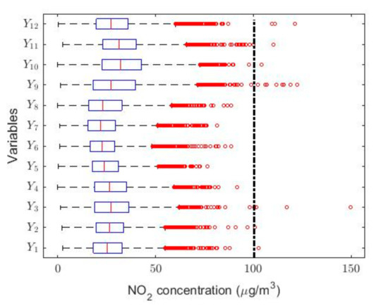 In Figure 1, it can be seen that half of the years under study have observations that are above the desirable level of pollution [8]. Nevertheless, every year the NO2 concentration presents abnormally high observations. The latter again indicates that the variables under study do not come from Gaussian distributions, although the percentage of outliers does not exceed 2.1%.