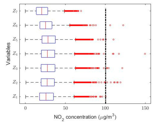 The box plots shown in Figure 5, Figure 6 and Figure 7 show that the variables taken into account have extreme observations on the right, which are generally close to each other, although occasionally some of the variables present very extreme observations. Therefore, the desirable NO2 concentration level is sometimes exceeded.
