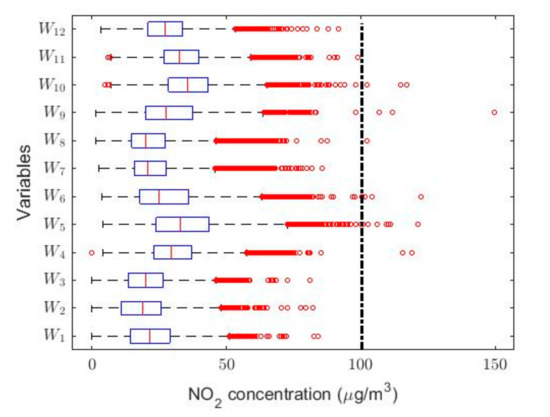 In the box plots shown in Figure 1, a dashed straight line has been included indicating the separation between having a desirable level of pollution due to the NO2 concentration at Belisario station (i.e., ) and an acceptable level of pollution (i.e., ). This classification, regarding the air pollution due to the NO2 concentration, is established in Quito by the Quito Air Quality Index (QAQI) [8].