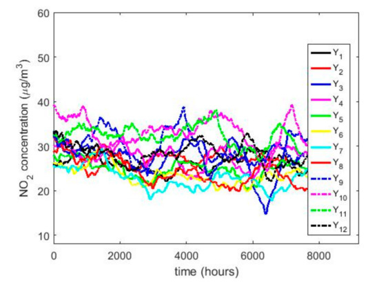 The data collection process in this research started on 1 January 2008 and ended on 31 December 2019, and the sampling period was equal to one hour [8,10]. Therefore, 12 years of NO2 concentration measurements corresponding to 105,193 data will be analyzed. However, since some data did not appear and others had negative values, the research was carried out with at least 96% of all possible data. In other words, less than 4% of the total of all possible data was lost. Furthermore, in accordance with [36], at least 75% percent of scheduled samples for each year were collected.