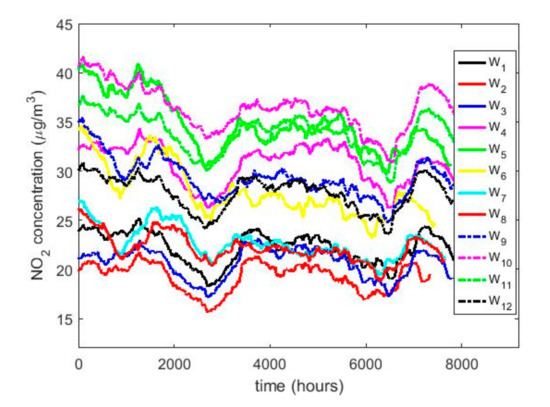 Moving average of the NO2 concentrations: (0:00–1:00), (2:00–3:00), (4:00–5:00), (6:00–7:00), (8:00–9:00), (10:00–11:00), (12:00–13:00), (14:00–15:00), (16:00–17:00), (18:00–19:00), (20:00–21:00), and (22:00–23:00).