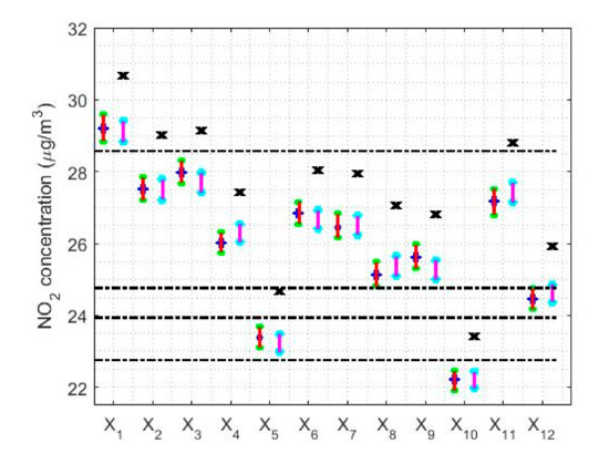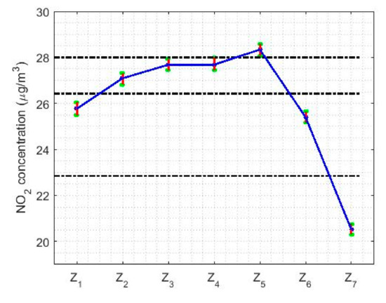 At this point, it is important to mention that all the categories are separated from each other by an NO2 concentration equal to a unit of measurement. Although, the third category has an amplitude of three units of measurement. However, there are differences in the widths of the measurement intervals. On the other hand, it is also verified again that the confidence intervals are at the desirable level of air pollution, according to QAQI [8]. Furthermore, in no case do the values of the confidence intervals come close to the acceptable level of air pollution due to the NO2 concentration, which shows that the desirable level of air pollution is exceeded in a circumstantial way.