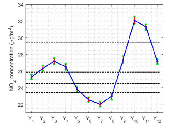 From that moment, the NO2 concentration rises until reaching to its maximum value, which is approximately equal to and which is reached in October. In other words, in the summer months the NO2 concentration drops to a little more than half its maximum value. Furthermore, the drop in NO2 concentration levels appears to have two steps. The first of these steps is reached at the end of the year, at which point the NO2 concentration stabilizes and remains stable until April. Then, the NO2 concentration drops again until it reaches its minimum value in July. These results are similar to those obtained in Figure 12. Furthermore, the amplitudes of the confidence intervals seem, in general, to be smaller than for the analysis by years. Likewise, there is also the effect that the higher the median value, the greater the width of the intervals.