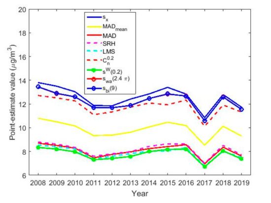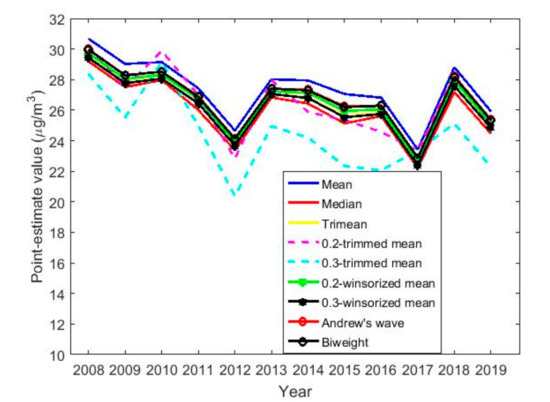 Next, as was done in [5,20,21], different location and scale statistics were found, which were used to build robust confidence intervals. At this point, it is worth mentioning that all location estimates were bounded by the median and the 0.2-trimmed mean. In addition, it is clearly observed that the concentration of NO2 has all its values in the range of desirable values, decreases in the years 2012, 2017 and 2019, and is higher in 2008. But, the difference between the greatest concentration value and the smallest value on each curve representing the location estimates by year is less than .