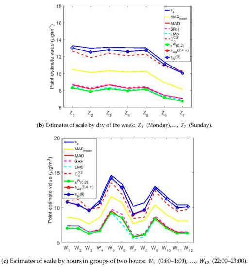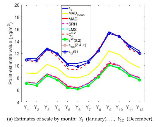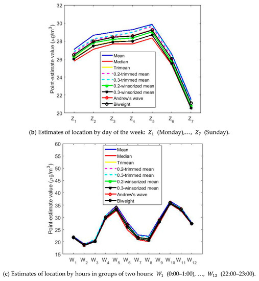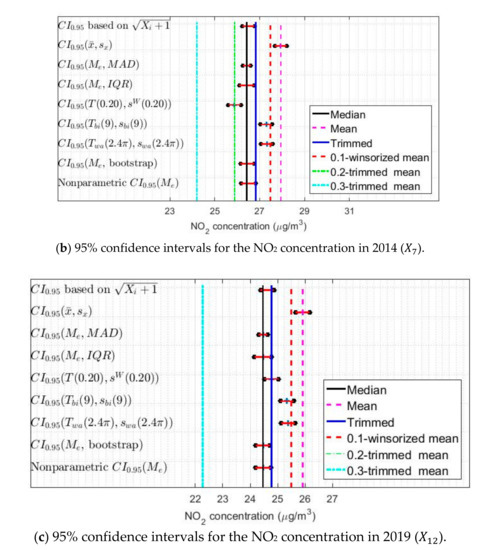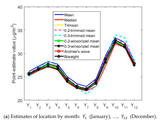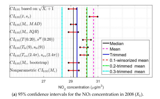Finally, it is important to mention that nonparametric statistical methods have also been used to estimate the behavior of air pollution variables [25,26,27,28,29,30,31,32]. However, the results obtained using nonparametric methods are inferior to those obtained using robust methods, in the sense that robust methods are practically immune to the influence of extreme values. Therefore, robust methods generate confidence intervals that are narrower than those generated using nonparametric methods [5,20,21].