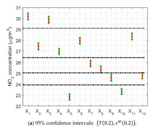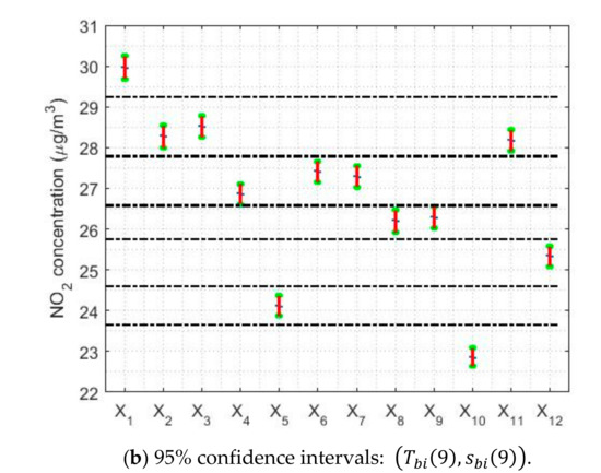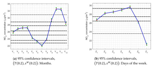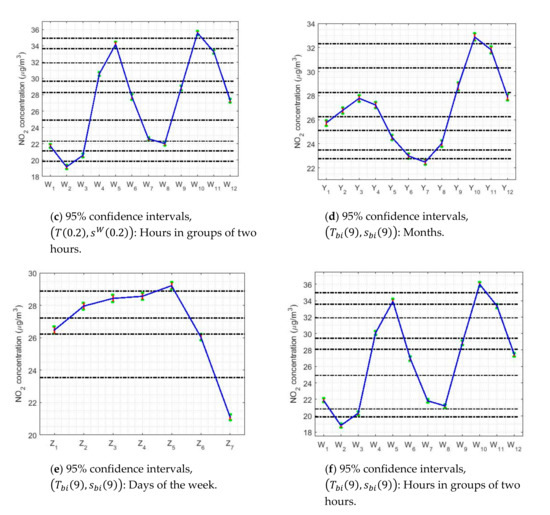 Figure 21 shows the confidence intervals based on and for the analysis by months, days and hours. In Figure 21a,d, it is observed that the lowest NO2 concentration values are reached in the month of July, with values that are approximately equal to .