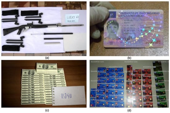 Images crawled from Tor darknet. Samples from (a) dismantled weapon, (b) fake id, (c) fake money and (d) credit cards.