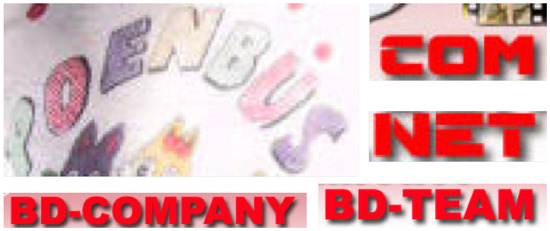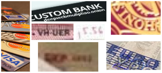 We can attribute the lower score obtained in these works [22,23] to different image quality factors, such as colour distribution, brightness, and partial occlusion, some of which we illustrate in Figure 2. Other problems affecting the text recognition task include multiple fonts or languages in the same image, character similarity, lighting conditions or even mistakes when labelling the images [24]. Although these are frequent problems in state-of-the-art datasets, the issues of low resolution and oriented text are the most remarkable in both CSA and Tor-based images [23]. In Tor images, it is very common to fit several documents in a single picture to express quantity or product variations. This problem becomes worse if, after the text is detected, the image is cropped to include only the text content. In such cases, the quality of the cropped section can decrease further depending on the file format chosen when saving the image. Such degradations in image quality reduce the performance of text recognizers.