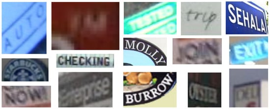 - Karatzas, D.; Gomez-Bigorda, L.; Nicolaou, A.; Ghosh, S.; Bagdanov, A.; Iwamura, M.; Matas, J.; Neumann, L.; Chandrasekhar, V.R.; Lu, S.; et al. ICDAR 2015 competition on robust reading. In Proceedings of the 2015 13th International Conference on Document Analysis and Recognition (ICDAR), Tunis, Tunisia, 23–26 August 2015; pp. 1156–1160. [Google Scholar]
