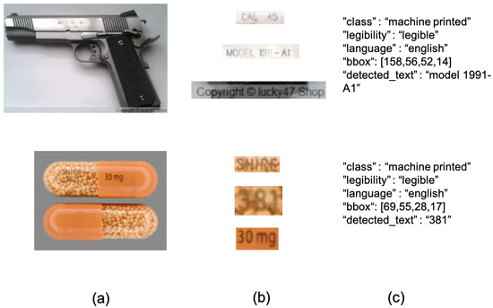 TOICO-1K sample images. (a) represents the original image, (b) cropped text regions and (c) details labelling examples.