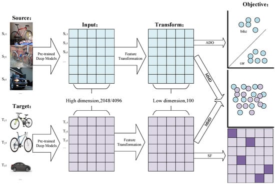 where represents the sparse loss on the target domain, represents the discriminative loss of the source domain, and denotes the MMD loss between the source and target features. are the parameters that balance the three objectives. Obviously, and correspond to the two goals presented in []. Furthermore, we require the target domain features to be discriminant. A graphical illustration of the framework is shown in Figure 1. Given raw pictures from source and target domains, we first extract their vectorized features with pre-trained deep models, e.g., Alexnet and Resnet. It is worth noting that we do not employ any fine-tuning. Then, they are further reduced in dimension by a linear transformation matrix W, after steps 1–3. The objective constructing on the learned representation can be divided into three parts: (1) source domain—objects from different category should far away from each other; (2) target domain—the learned representation should be sparse; and (3) cross-domain—there should not be clear gap among two domains’ samples.