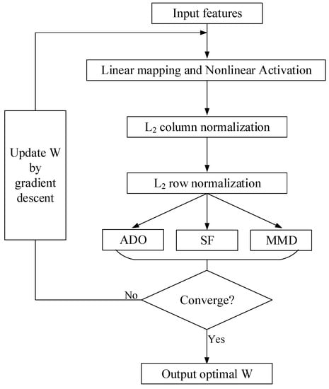 Many studies focus on dimensionality reduction to facilitate calculation and visualization []. Similarly, domain adaptation can also be considered as a feature extraction problem to extract discriminative and shared features. For features with low dimension, it is generally considered that the good features may hold more information, which has been proven to be effective in auto-encoder [] and reconstruction independent component analysis []. The reconstruction error guarantees the completeness of features. However, for the problem of domain adaptation, feature completeness is not necessary because of the inconsistent distribution between the two domains. The knowledge or features are not completely shared between the two domains []. Another criterion for extracting features is sparsity, which is generally used as a regular item []. Sparse filtering proposed in [] avoids explicitly modeling raw data, and obtains ideal features by constraining the sparsity of features. Sparse representation-based methods have also made dramatic progress in visual recognition [].
