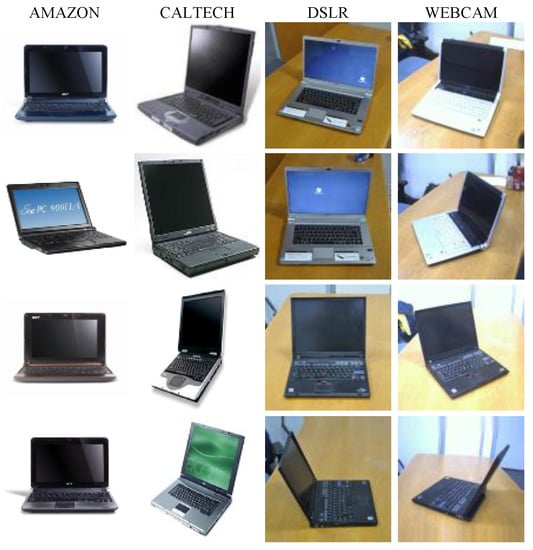 Office-Caltech10 data set is proposed in [], which consists of four domains—AMAZON (A), CALTECH (C), DSLR (D), and WEBCAM (W). It comes from the e-commerce website (AMAZON), data set caltech-256 (CALTECH), high-resolution digital camera photo (DSLR), and low-resolution photo (WEBCAM). Each domain has 10 types of objects, including laptop, monitor, and so on. Figure 4. shows the laptop in different domains. It can be seen that there are differences between domains, which brings difficulties to image recognition.