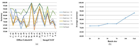 Here, we analyze how mini-batch SGD affects the proposed method. Since we use random mini-batch instead of the full batch, the sampling error cannot be ignored. For sparse filtering (corresponding to ), as an unsupervised feature extraction method, it requires a diversity of data. In extreme cases, suppose that we have data from the same class. Sparse filtering tries to extract distinguishable features; in other works, it tries to make samples from the same class to be different, which is counterintuitive. For alternating discriminant optimization (corresponding to ), it learns discriminative features with labeled source samples. If the samples belong to the same class in the mini-batch, it outputs meaningless gradients. For MMD (corresponding to ), it measures the domain discrepancy with first-order statistics. The sampling error is reflected in the gap between the mean of mini-batch and the full batch (). To summarize, using mini-batch SGD will lead to performance degradation and the degradation will become larger as the batch size becomes smaller. As Figure 6 shows, the proposed method achieves higher accuracy as the batch size becomes larger, as does the average accuracy. It is worth emphasizing that using mini-batch based optimization is not time-efficient; in fact, it often costs more time. The reason is that we need a small step size and more iterations to train the model, since a min-batch provides a biased estimation of the whole data set. It works when our computer cannot handle the large data set at a time—in other words, it can be seen as a trade-off of time and space.