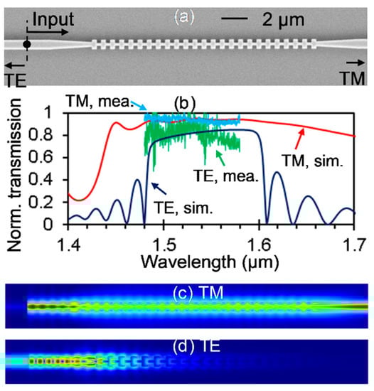 The fabricated in-line polarization beam splitter (PBS). (a) SEM image. (b) Simulated and measured spectra. Simulated light propagation at 1550 nm for the TM (c) and TE (d) modes.
